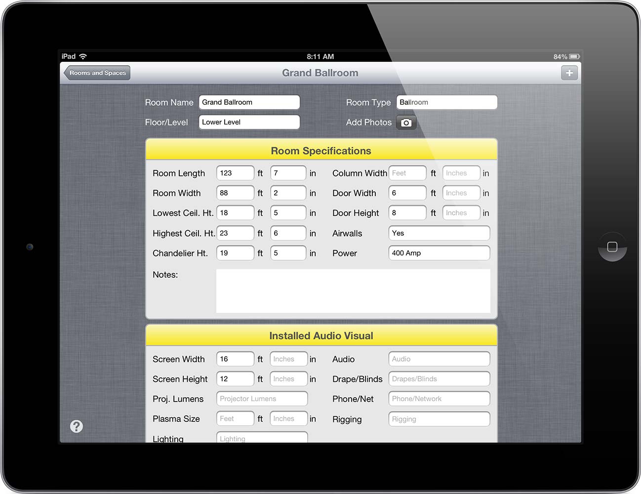 This is where all of the specifics for each room is recorded. Any installed AV is documented, as well as dimensions, ceiling heights, and other critical room information. You can also take pictures of the room (on a camera equipped device) in this section. At the bottom of this section is the Sketch area for creating a quick floor plan for easy reference.