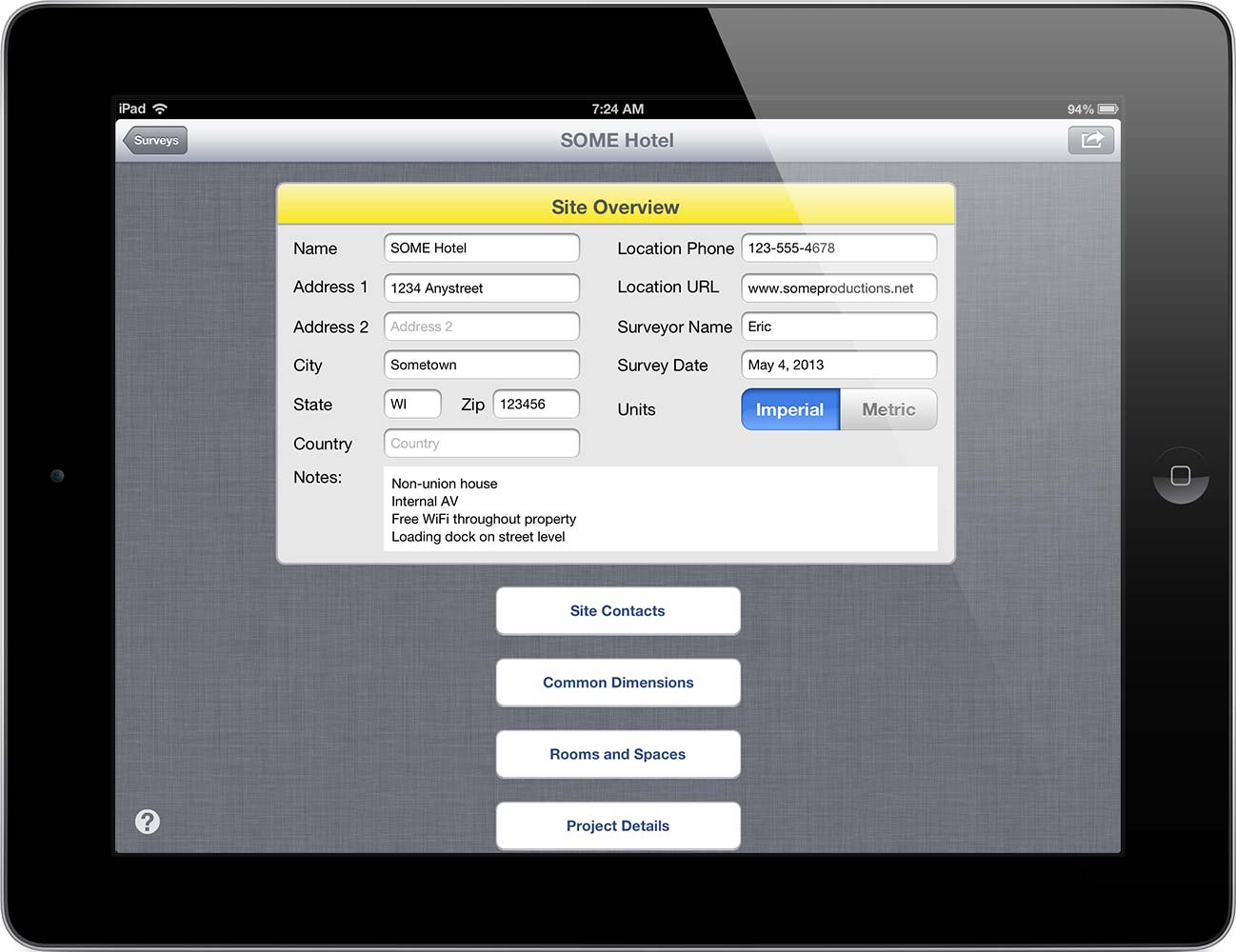 SiteSurvey for Meetings & Events is an information gathering tool for people working in the Meetings and Events business. It’s main purpose is to aid in making a complete record of reference for a potential event space. Technical Directors, Meeting Planners and others will find this application useful when visiting potential event locations.