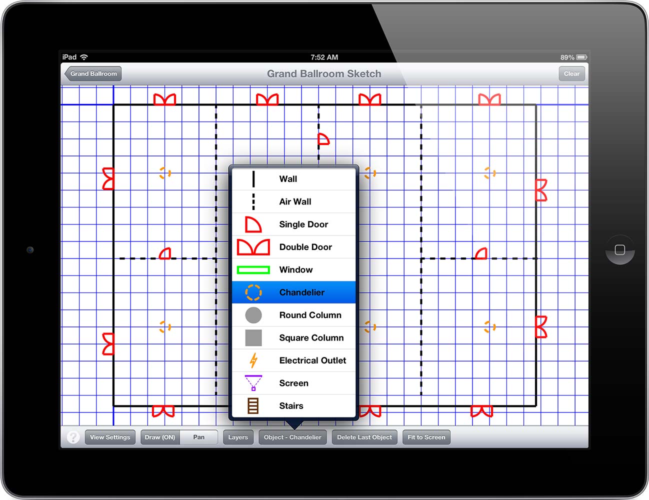 In the Sketch area you can do a quick reference drawing of the room. If the space is a simple rectangle you can draw a Quick Room from the dimensions you’ve entered in the Room Survey section, otherwise you have the option to draw the room one wall at a time. Once you’ve drawn out the room walls you can add items such as doors, columns and other room specifics.